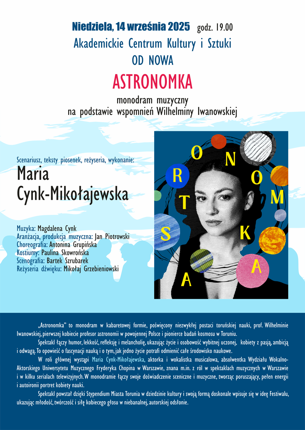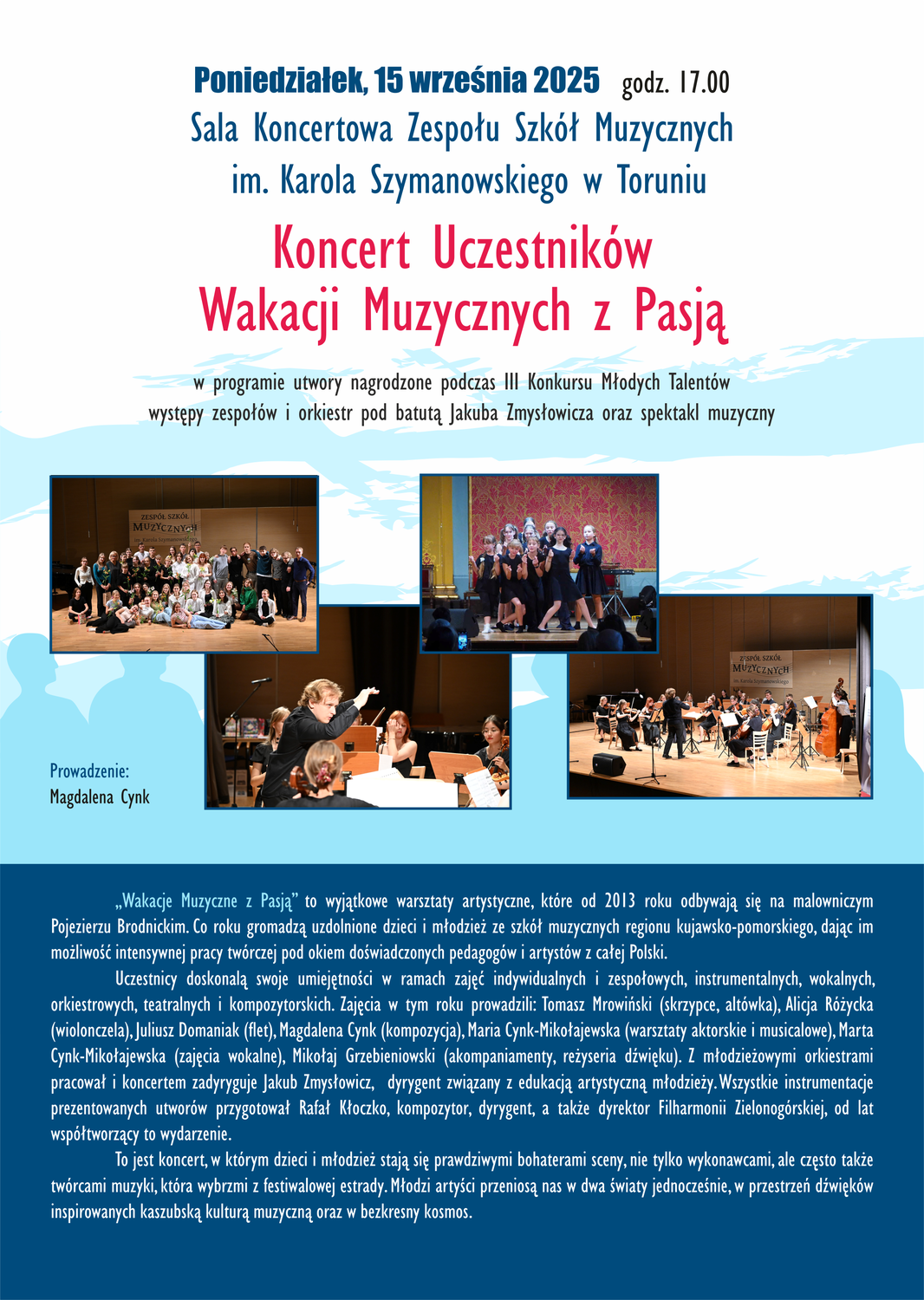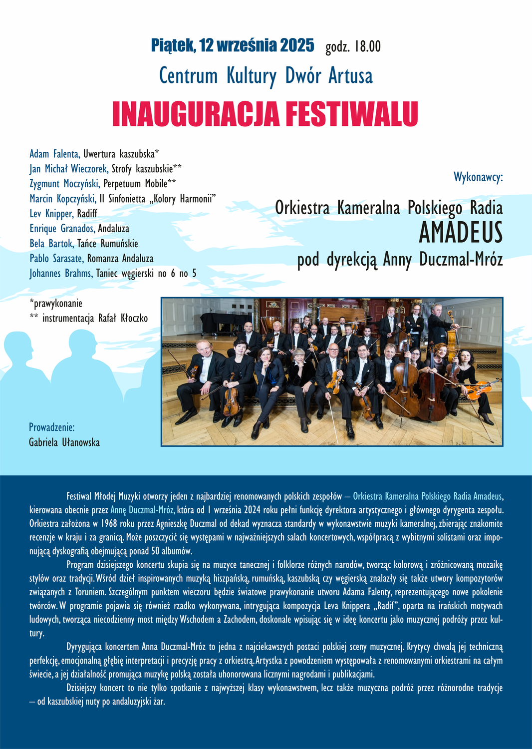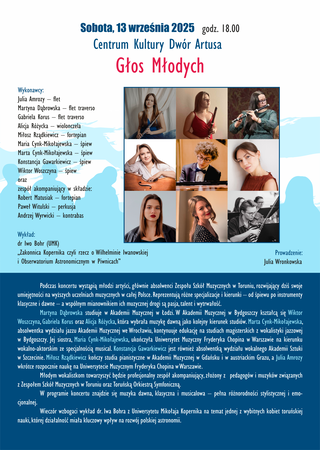 Piąta edycja Festiwalu Młodej Muzyki będzie ponownie promocją polskiej muzyki współczesnej skupiającą się na prezentacji młodych twórców i artystów związanych z regionem kujawsko-pomorskim oraz na pielęgnowaniu pamięci o toruńskich twórcach kultury. Zabrzmi przede wszystkim muzyka nowa, klasyczna, ludowa, elektroakustyczna i jazzowa. Nie zabraknie prawykonań i współpracy z artystami i kompozytorami z innych ośrodków muzycznych w Polsce. Oprócz koncertów odbędzie się spotkanie z kompozytorką, warsztaty, wystawa, spacer, konkurs, dwa wykłady oraz spektakl teatralny. Pozwoli to odbiorcom Festiwalu na wieloaspektowe doświadczenie twórczości artystycznej. Festiwal będzie trwał od 12 września do 21 września 2025. Wystąpią soliści i zespoły, a także dwie orkiestry i jeden chór. Kompozytorzy w swoich nowych utworach będą inspirować się ludową muzyką kaszubską oraz astronomią. Z okazji ogłoszonego roku 2025 Rokiem Wilhelminy Iwanowskiej wiele wydarzeń związanych będzie ze słynną naukowczynią. Podczas dwóch tradycyjnych koncertów in memoriam wspominać będziemy wybitnych artystów związanych z naszym regionem (pianistę Jerzego Godziszewskiego oraz kompozytora, Michała Zielińskiego). Festiwal zainauguruje wybitna Orkiestra Polskiego Radia Amadeus pod batutą Anny Duczmal-Mróz, z kolei koncert finałowy uświetni Orkiestra Filharmonii Zielonogórskiej pod batutą toruńskiego dyrygenta, Rafała Kłoczko.